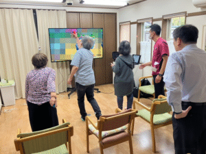 前半は先生より介護予防の基本についてわかりやすい講演、後半は理学療法士指導でe-スポーツを活用した体操を体験。笑顔と汗があふれる時間になりました。