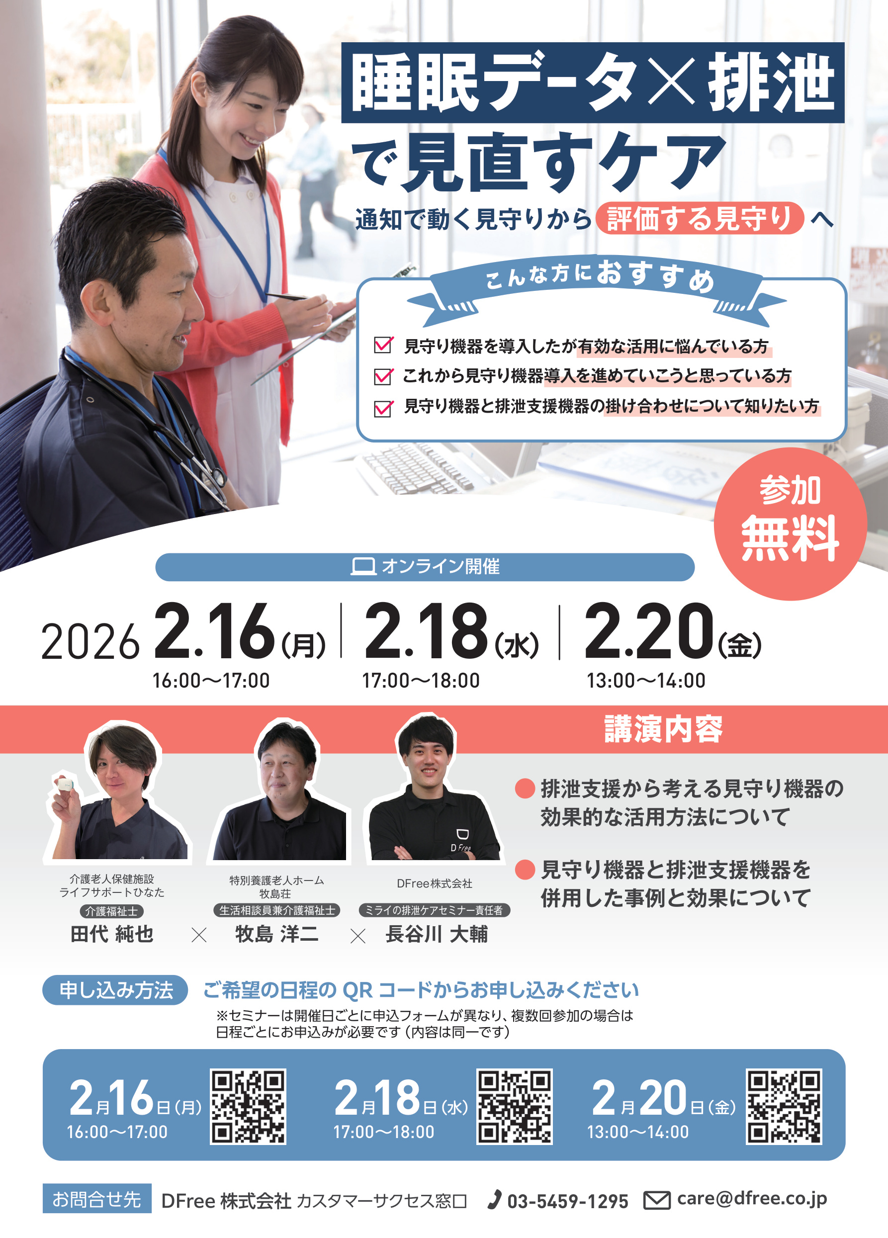 このたび、DFree株式会社主催のオンラインセミナー 「睡眠データ×排泄で見直すケア 〜通知で動く見守りから“評価する見守り”へ〜」 に、当施設の職員が登壇し、現場での取り組み事例を発表することになりました。