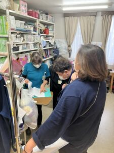 物品庫やフロアを巡回し、物品の保管方法(清潔・不潔の区分)、手指衛生(手洗い・消毒)の動線や設置状況、環境清掃のポイントなどを職員と一緒に確認しました。